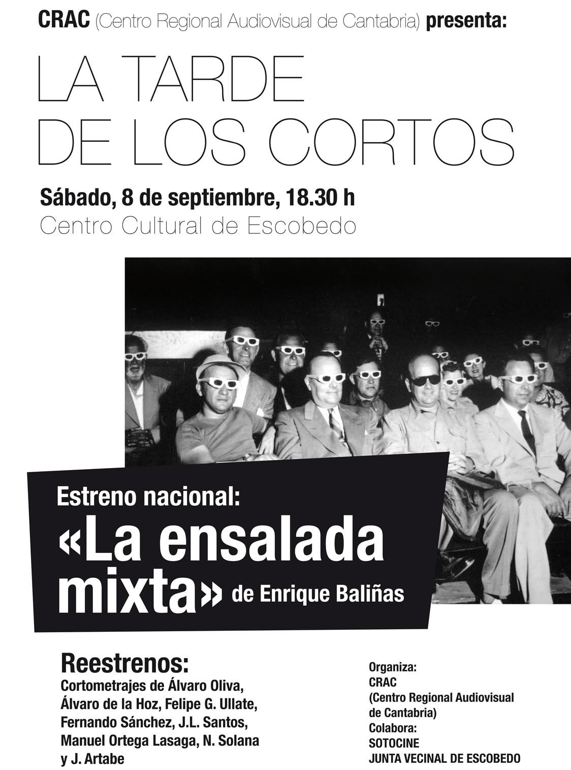 El CRAC (Centro Regional Audiovisual de Cantabria), a través de la Muestra permanente de Cortos y Largos de Cantabria “Sotocine”, realizará una nueva sesión de “La Tarde de los Cortos”. Este sábado 8 de Septiembre, a las 18:30 h, en el Centro Cultural Escobedo (Camargo, Cantabria).
