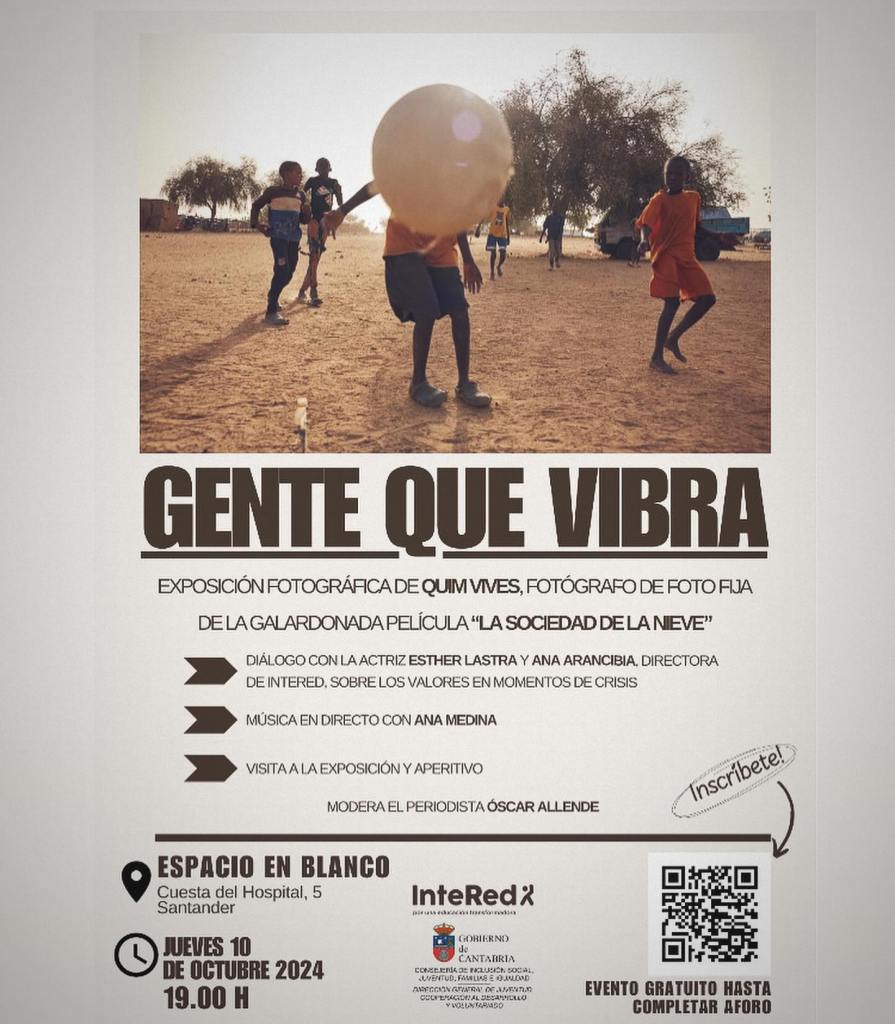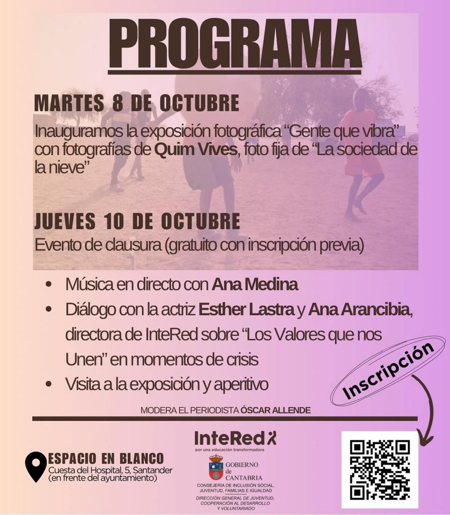 Este jueves tenemos el honor de colaborar con la ONG InteRed que incluye la exposición fotográfica ‘Gente que vibra’, de Quim Vives, fotógrafo de rodaje de ‘La sociedad de la nieve’, un dialogo sobre los valores en momentos de crisis con Ana Arancibia, directora de InteRed y música en directo con Ana Medina.